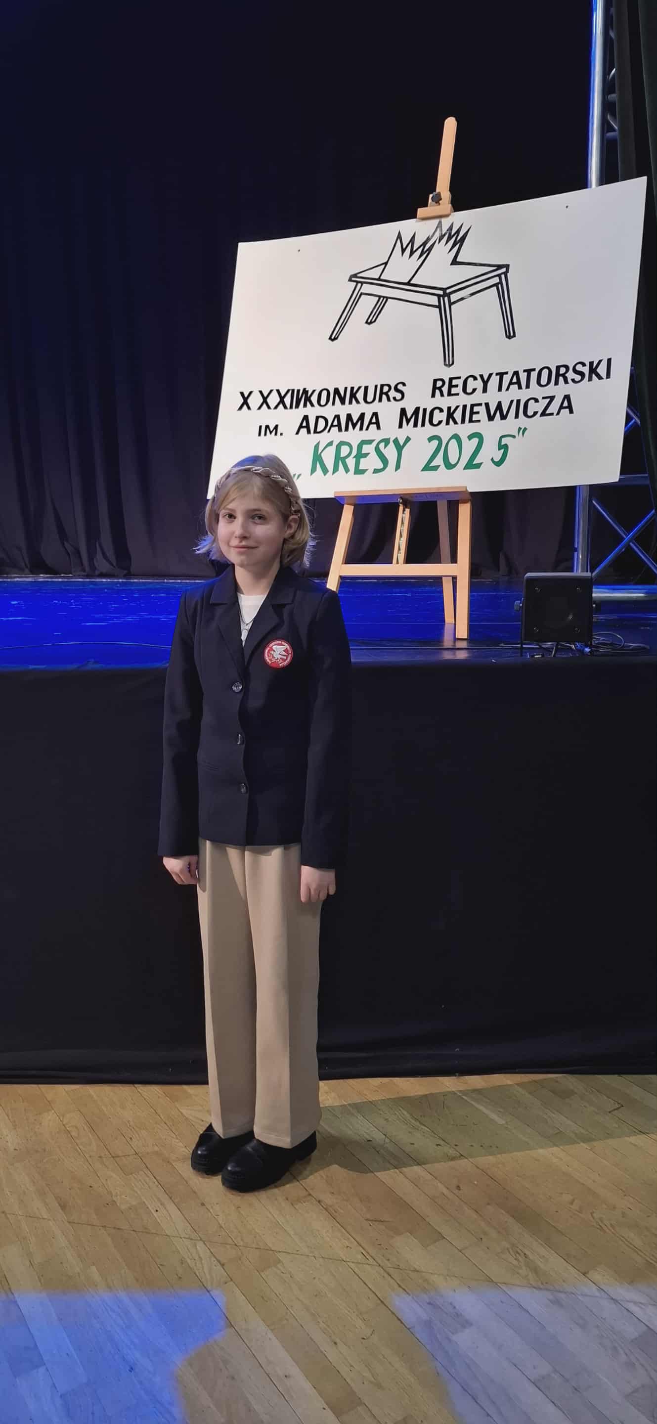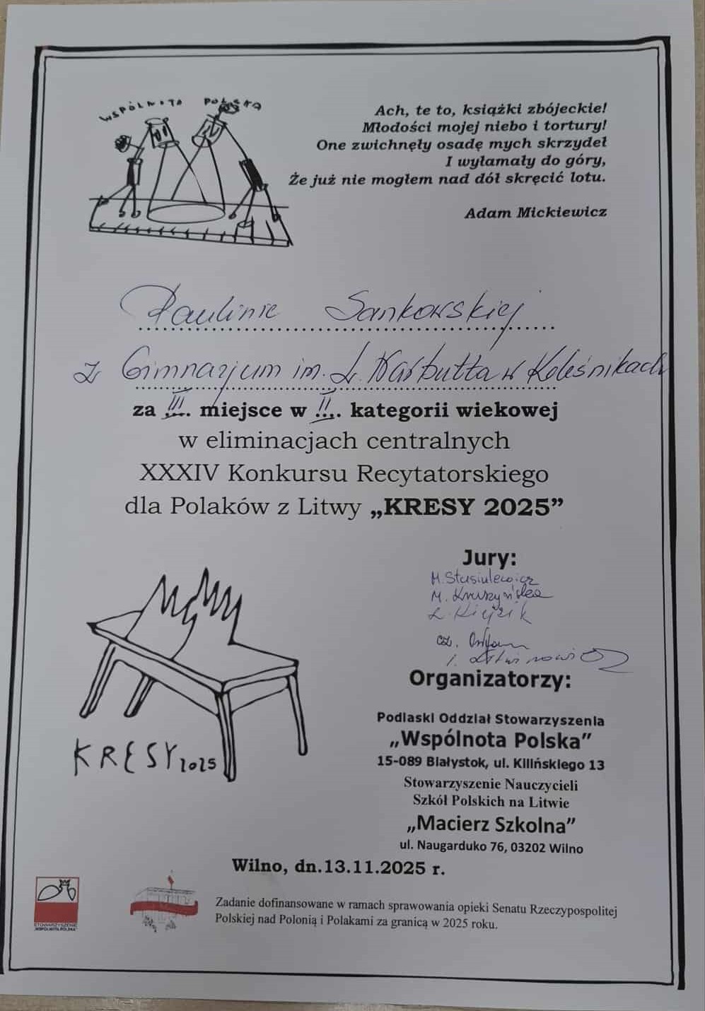 Su didžiuliu džiaugsmu pranešame, kad 6 klasės mokinė Paulina Sankowska užėmė 3-iąją vietą prestižinio deklamavimo konkurso „Kresy 2025“ centriniuose etapuose, kurie vyko lapkričio 13 d. Lietuvos lenkų kultūros namuose Vilniuje.