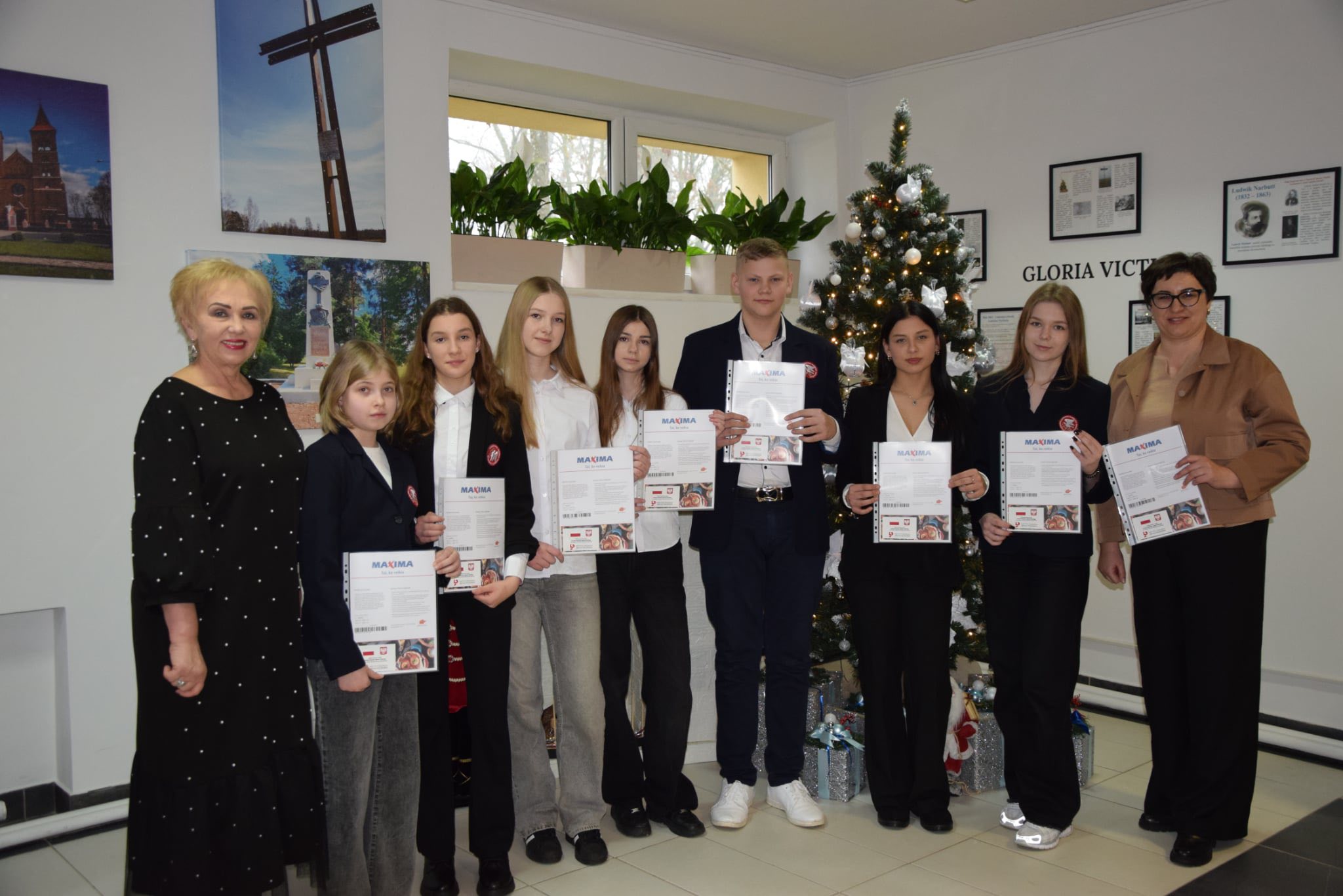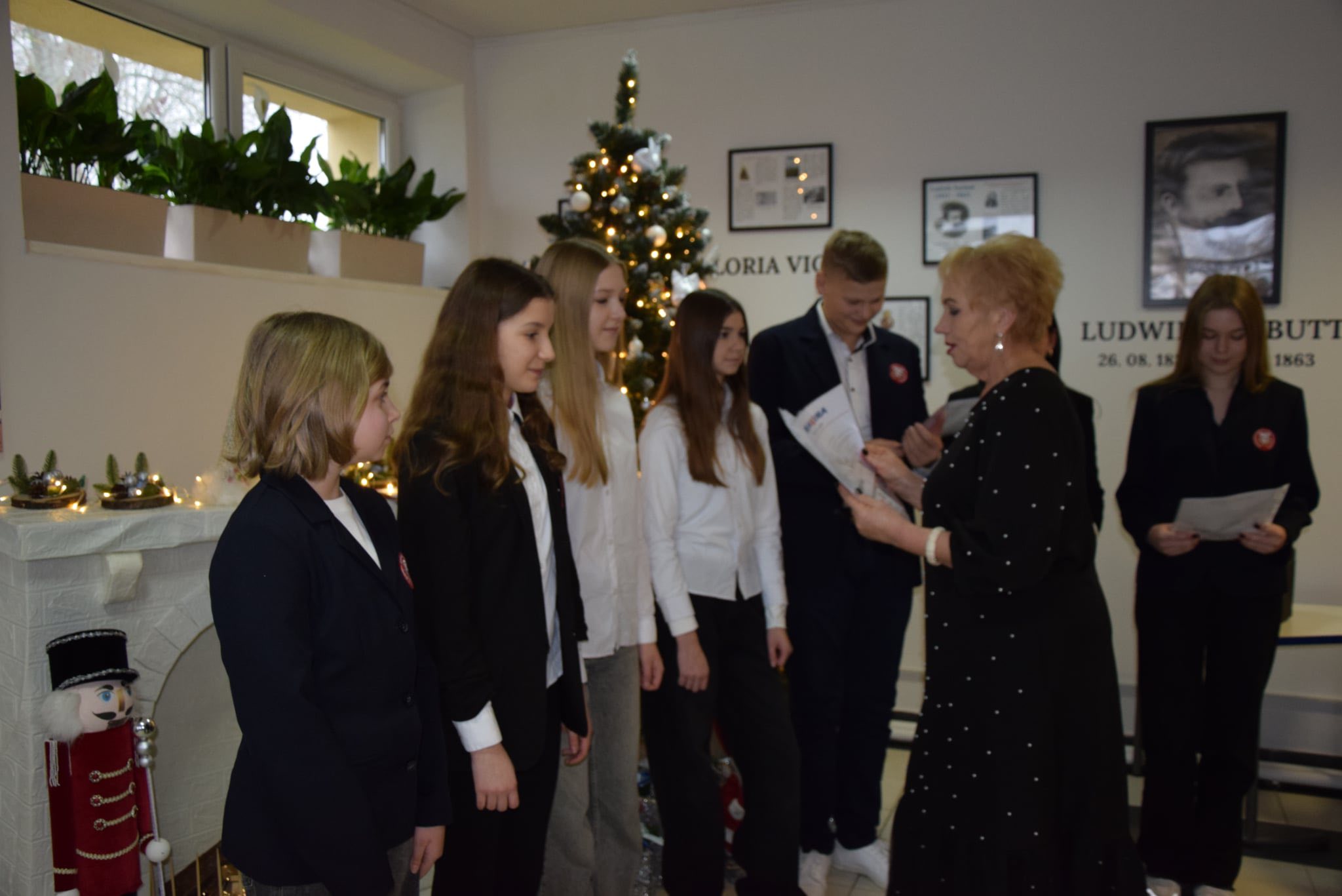 Podczas spotkania dyrektor gimnazjum podziękowała całej społeczności szkolnej za zaangażowanie w rozwój i promowanie placówki. Szczególnym momentem uroczystości było wyróżnienie uczniów za wzorowe wyniki w nauce oraz systematyczną pracę. Nagrody dla najlepszych uczniów zostały sfinansowane ze środków Instytutu Rozwoju Języka Polskiego im. św. Maksymiliana Marii Kolbego oraz Fundacji Wolność i Demokracja w ramach projektu „Bon uczniowski”.