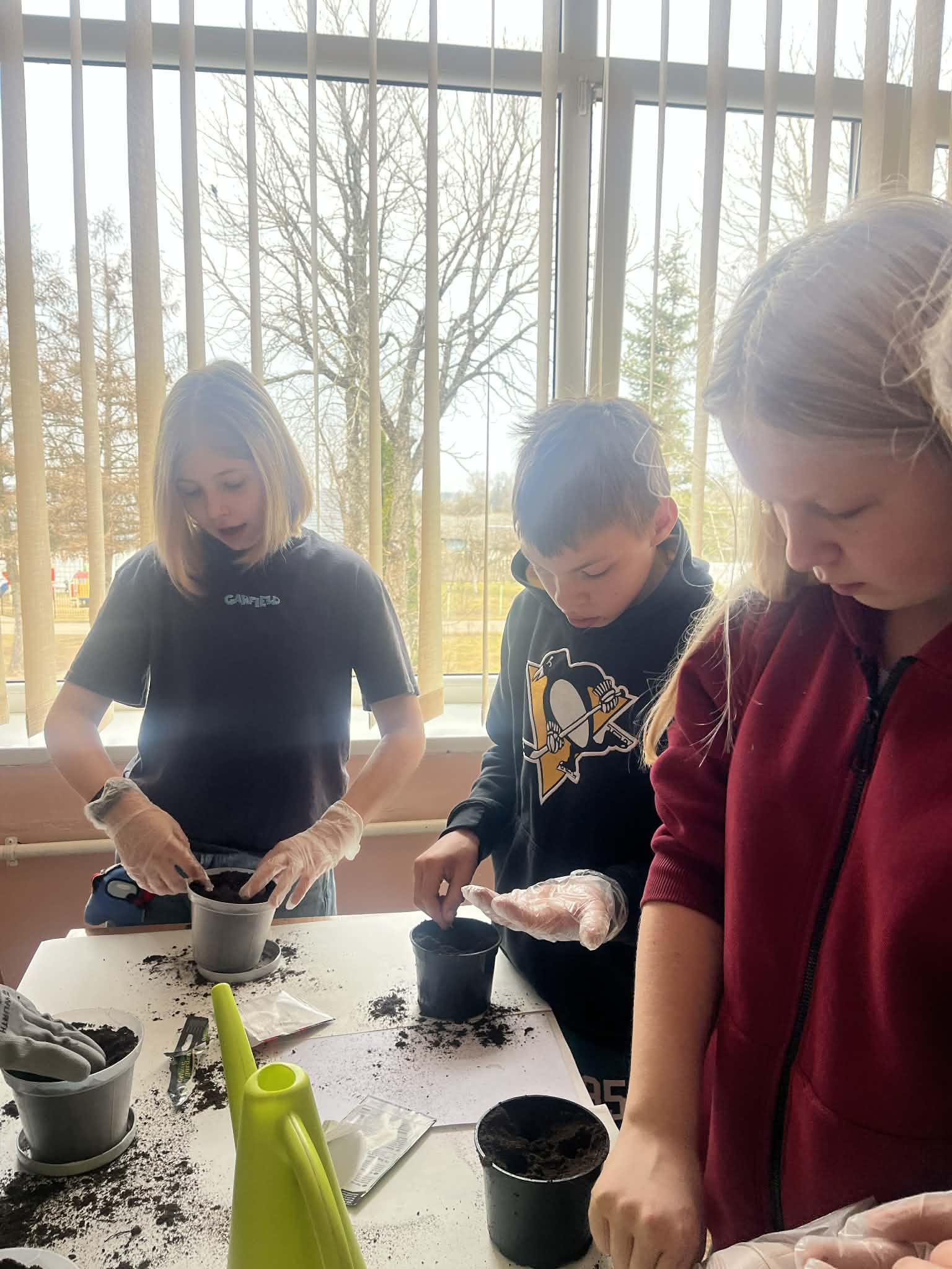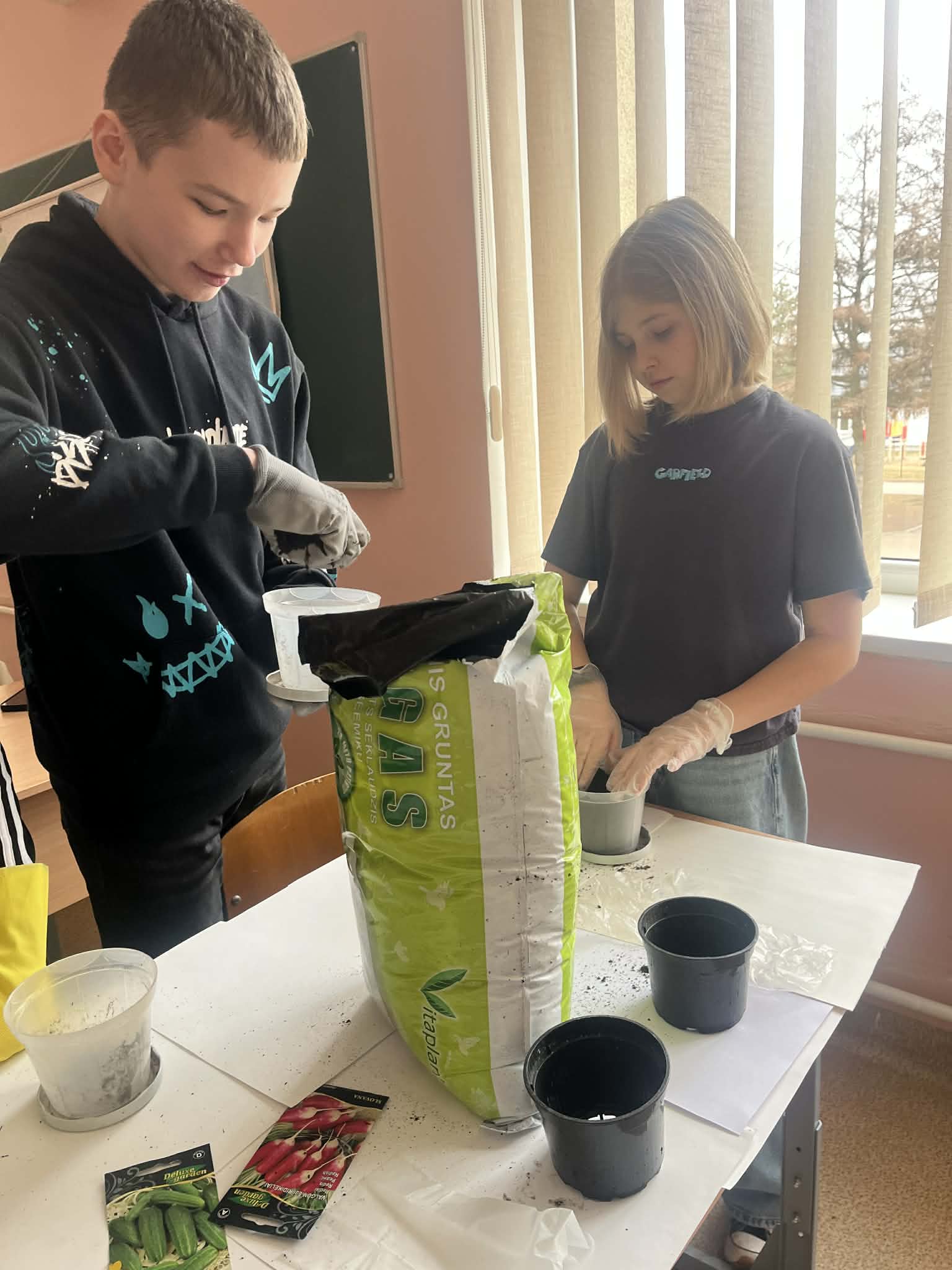 Gamtos mokslų pamokų metu mokiniai kartu su mokytoja Valentyna Grinevič aptarė temą „Vazoniniai augalai – gyvenimo sąlygos, priežiūra ir svarba“. 5 klasės mokiniai sužinojo apie vazoninių augalų priežiūros principus, aptarė laistymą, tręšimą ir tinkamą augalų išdėstymą namuose. Tai padėjo jiems išmokti rūpintis augalais, kad gėlės augtų sveikai ir atrodytų gražiai. Mokiniai sužinojo apie šaknų, stiebų, lapų ir žiedų funkcijas. Taip pat tyrinėjo, ko augalams reikia, kad išgyventų – šviesos, vandens, oro ir tinkamos temperatūros. 6 klasės kiekvienas mokinys turėjo galimybę savarankiškai pasėti agurkų ir ridikėlių sėklas į paruoštus vazonėlius. Mokiniai kruopščiai pripildė vazonėlius dirvožemiu, įdėjo sėklas ir švelniai jas palaistė. Jie dirbo su dideliu atsidavimu ir smalsumu, stebėdami kiekvieną proceso žingsnį. Užsiėmimo pabaigoje mokiniai pastatė savo vazonėlius į tinkamas vietas ir nustatė tolesnės augalų priežiūros gaires. Dabar jie gali nekantriai stebėti pirmuosius daigus ir savo augalų augimą. Pamokos buvo labai įdomios ir leido mokiniams įgyti praktinių įgūdžių, kuriuos jie neabejotinai pritaikys kasdieniame gyvenime.