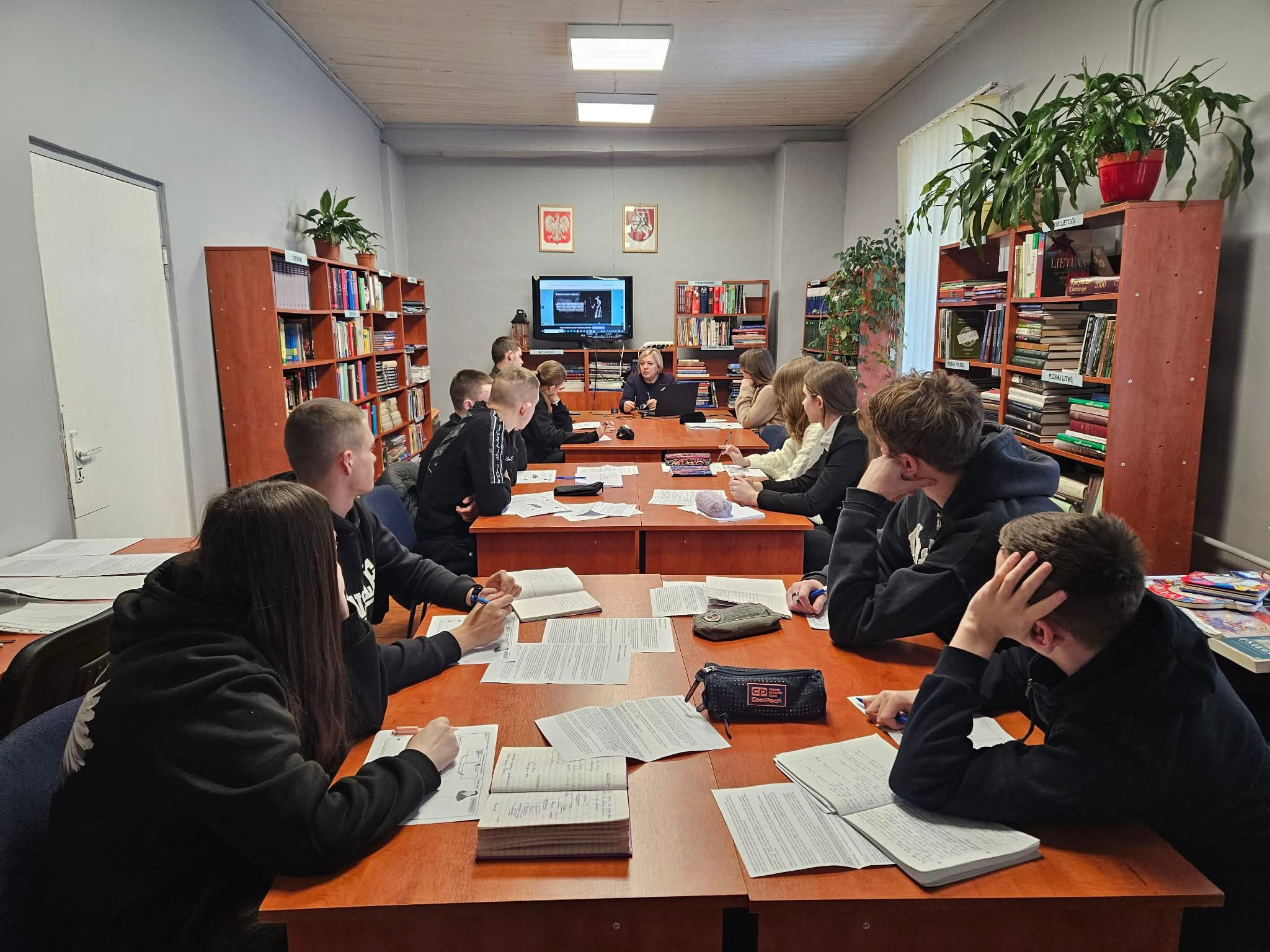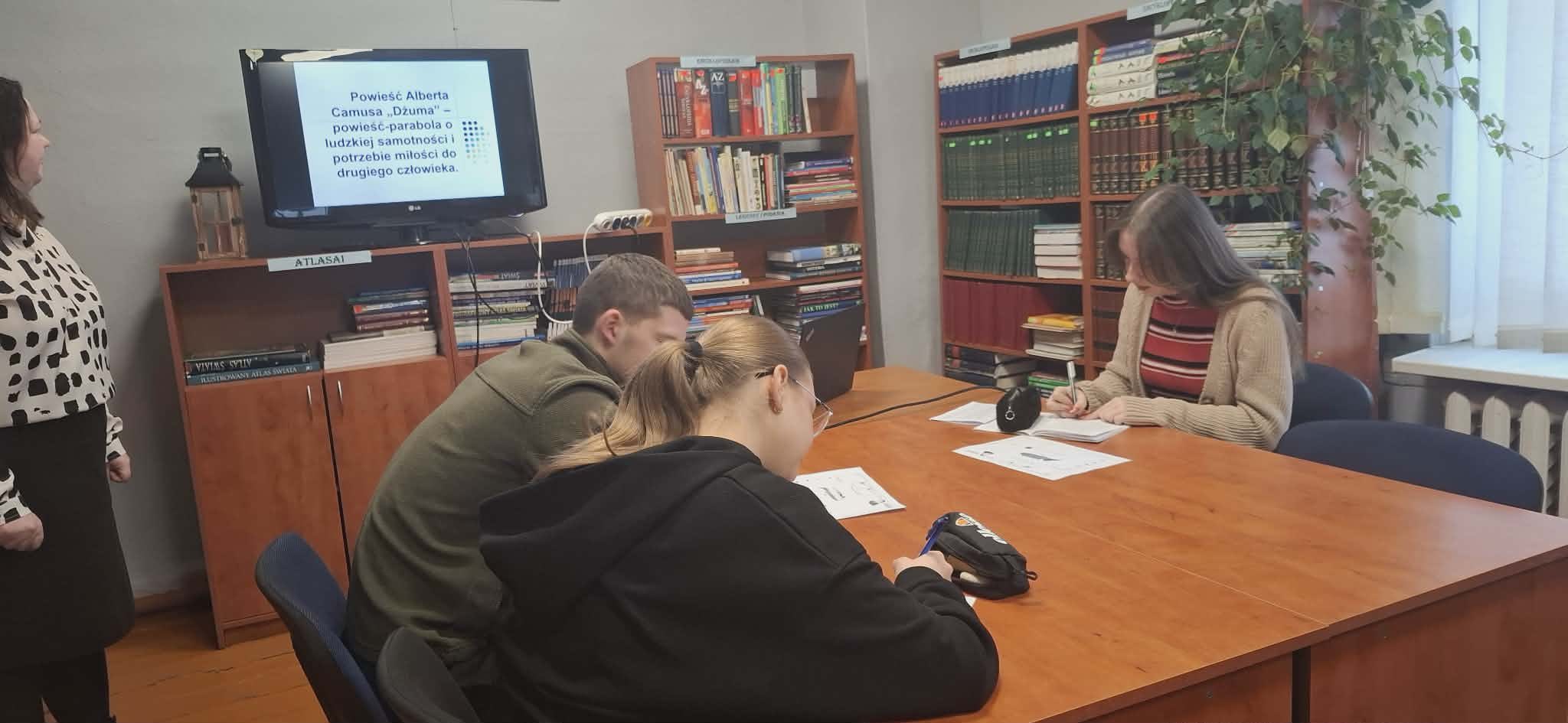 13 dieną IVG klasėje vyko integruota lenkų kalbos pamoka kartu su bibliotekininke tema „A. Camus romanas „Maras“ – romanas-parabolė apie žmogaus vienatvę ir meilės kitam žmogui poreikį“. Mokiniai susipažino su svarbiausiais rašytojo gyvenimo faktais, aptarė romano-parabolės bruožus, taip pat kūrinio turinį ir problematiką. Pamoka netradicinėje aplinkoje vyko greitai ir darbščiai.
