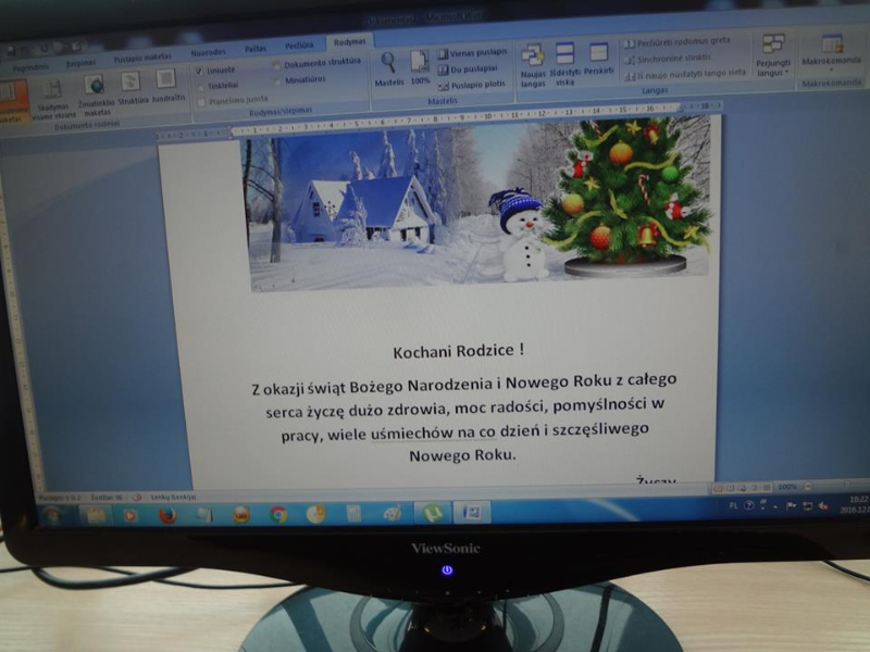 Gruodžio 7 dieną vyko integruota lenkų kalbos ir informacinių technologijų pamoka 7 klasėje „Kalėdiniai atvirukai ir linkėjimai“. Pamokos tikslas buvo išmokti sukurti šventinį atviruką ir tinkamai parinkti, išdėstyti paveikslėlius bei užrašus naudojant MSWord programą, WordArt priemonę, taisyklingai parašyti linkėjimus, išsaugoti pdf ir jpg formatu. Mokiniai sukūrė labai gražius atvirukus ir linkėjimus savo draugams, šeimos nariams, mokytojams. Ateityje mokės patys kūrybingai sukurti atvirukus ir pasveikinti kitus.