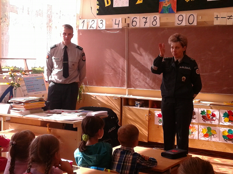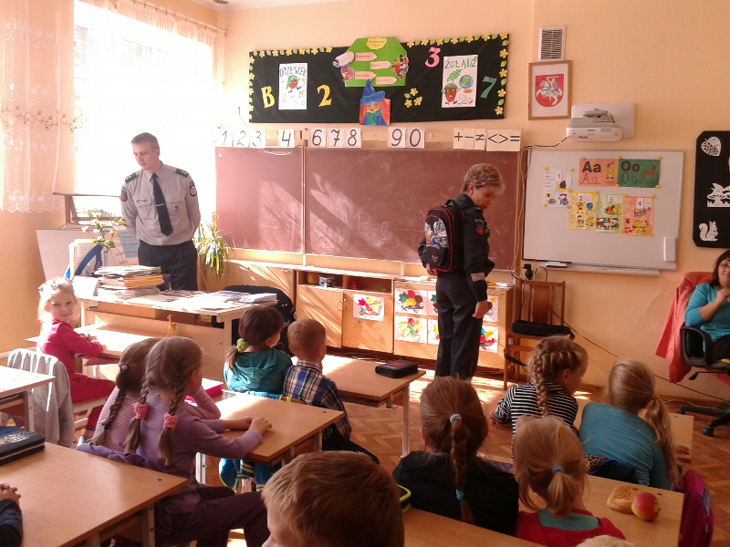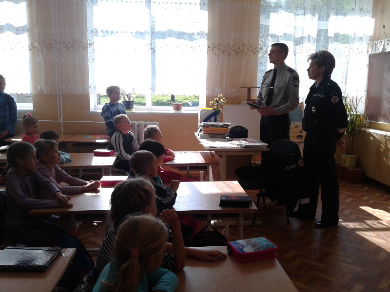 Rugsėjo mėnesį mokykloje apsilenkę policijos pareigūnai mūsų mažiesiems pasakojo kaip teisingai reikia elgtis kelyje, pereiti gatvę, kurioje pusėje nešiotis atšvaitą ir daug visokių dalykų susijusių su mažųjų elgesiu kelyje. Vaikams buvo įdomu ir labai naudinga išklausyti policijos pareigūnų.