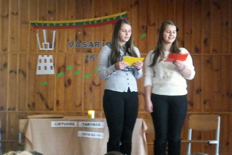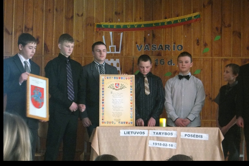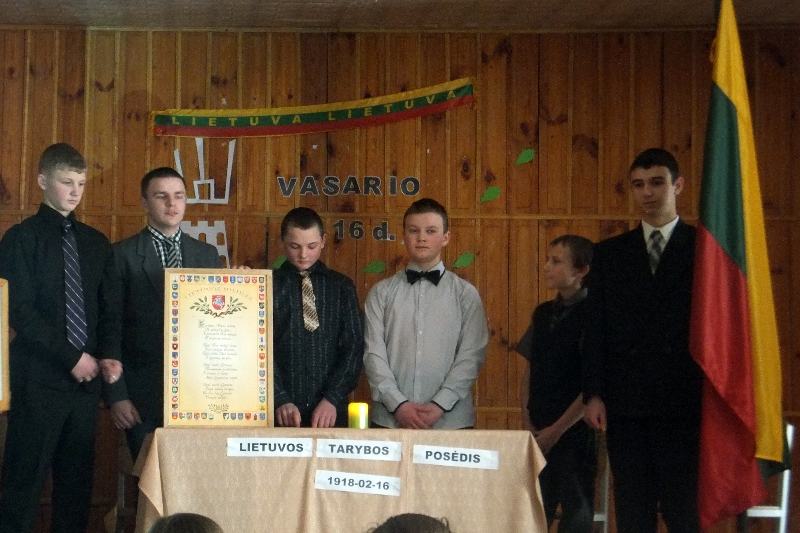 Vasario 16-oji – Valstybės atkūrimo diena – nacionalinė Lietuvos šventė, skirta 1918-aisiais Lietuvos Tarybos signatarų pasirašytam Lietuvos nepriklausomybės aktui paminėti. Šį svarbų dokumentą pasirašė 20 signatarų. Ši istorinė data Lietuvoje minima kasmet. Mūsų mokykloje ši diena taip pat yra ypatinga. Šiais metais mokiniai mokytojų pagalba paruošė gražų minėjimą. Skambėjo gražūs žodžiai, dainos ir eilėraščiai apie tėvynę. Istorijos mokytoja su įvairių klasių berniukais paruošė 1918 metų Nepriklausomybės akto paskelbimo posėdžio inscenizaciją. Berniukai įkūnijo signatarus, įdomu buvo pasiklausyti, pajausti tą dvasią, kuri sklido tuo metu Lietuvoje, kai buvo atkurta Nepriklausomybė, atgauta mūsų Trisplavė, Vytis, vėl suskambo Vinco Kudirkos Tautiška giesmė. Žmonės kartu gali padaryti tai, ko nepajėgtų pavieniui; protų ir rankų vienybė, jėgų sutelkimas – beveik visagaliai (D.Vebsteris). Ši šventė – mūsų protų ir laisvės simbolis. Mylėkime savo tėvynę…